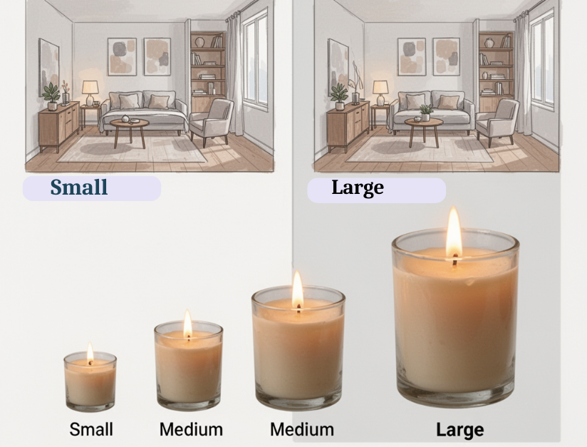 Large candles release stronger fragrance and may not be suitable for compact spaces. Smaller candles are ideal because they spread fragrance gradually.